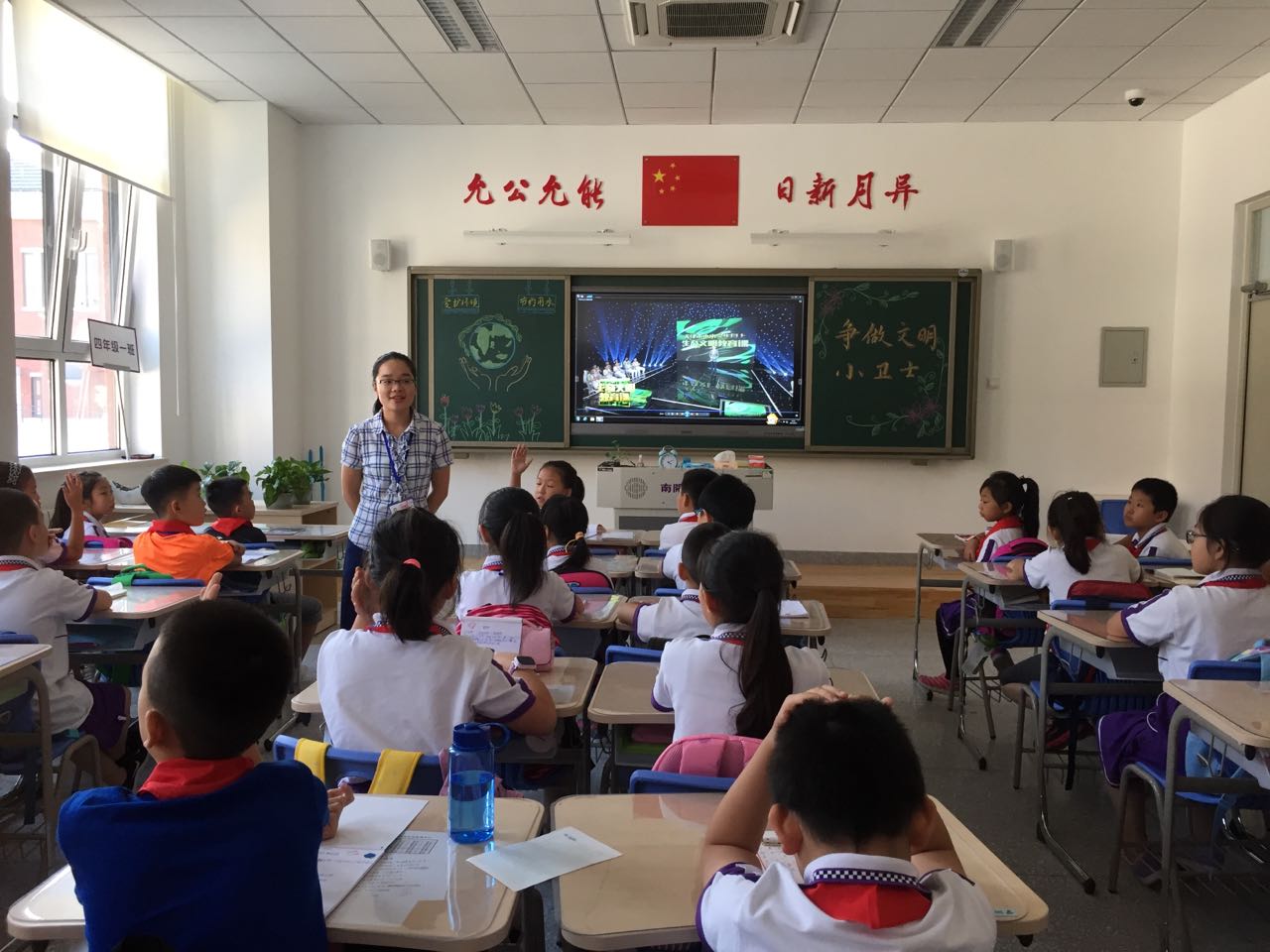 15点20分,记者走进海河教育园区南开学校,看到全部教室的多媒体设备都已开启。在四年一班教室,班主任秦星老师早早地在黑板上写下了几个大字“争做生态文明小卫士”。 15点25分,全市中小学同上生态文明教育课活动正式开始。